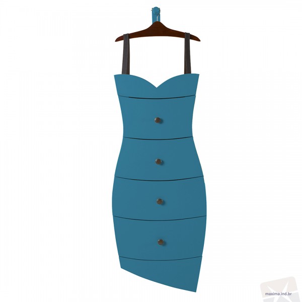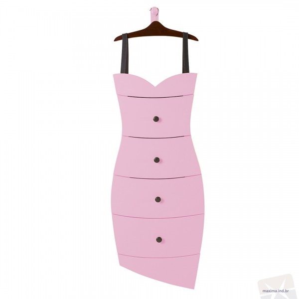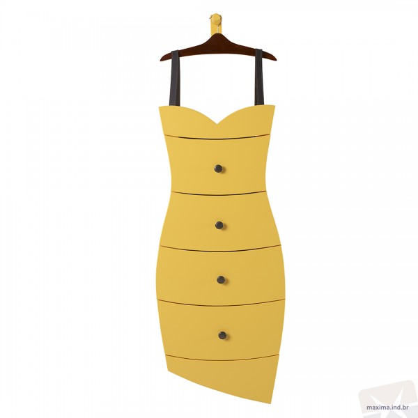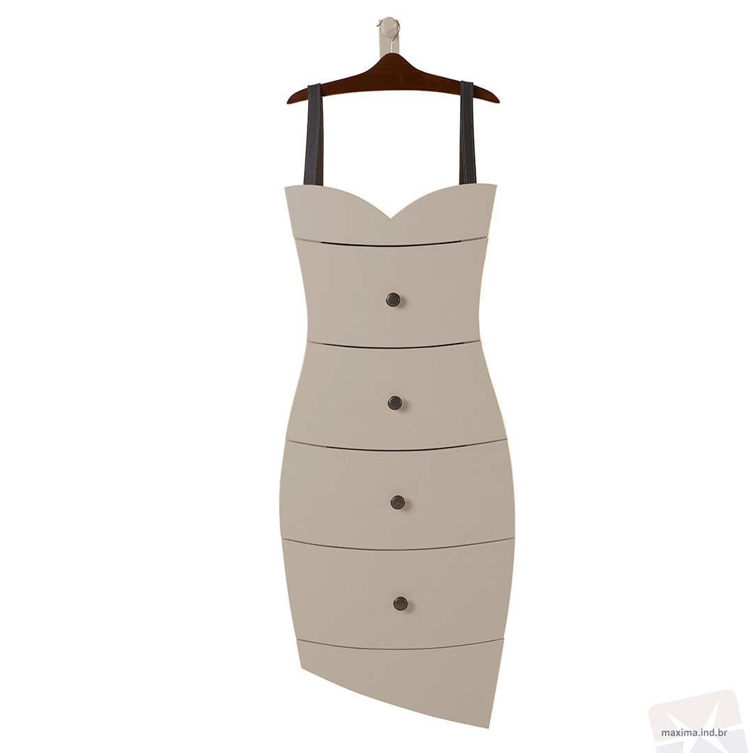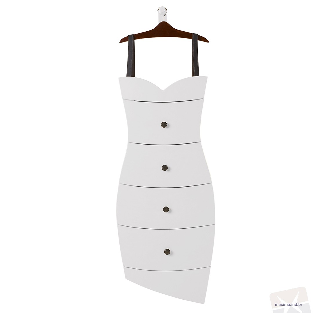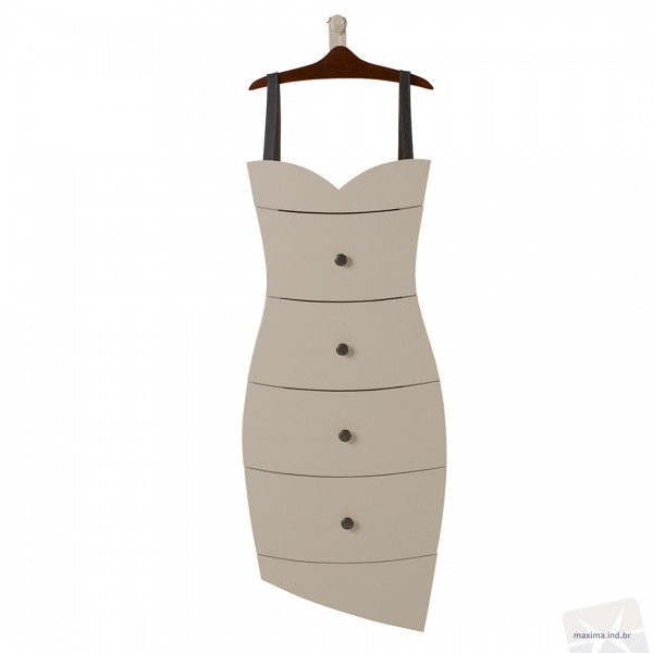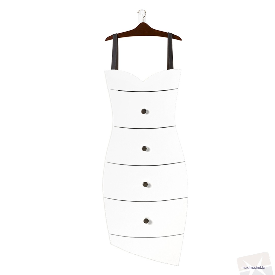 A cômoda Dress com o contorno e formato de vestido é perfeita para deixar o ambiente mais descolado, divertido e super moderno. Fixada na parede irá complementar sua decoração, com 04 gavetas é ideal para acomodar suas peças de vestuário ou objetos pessoais.