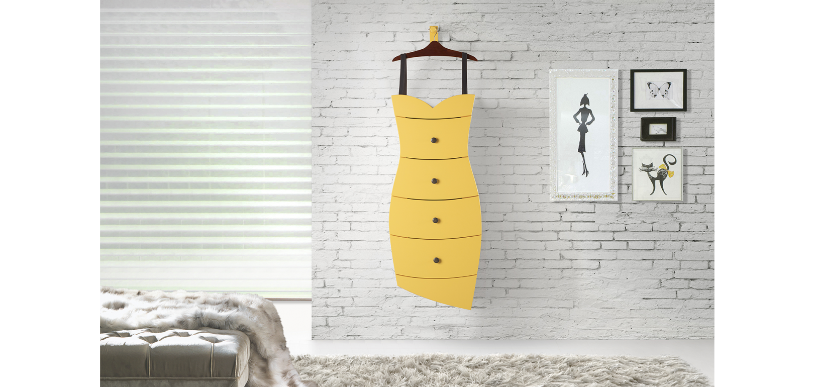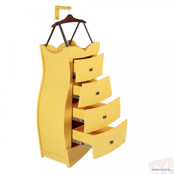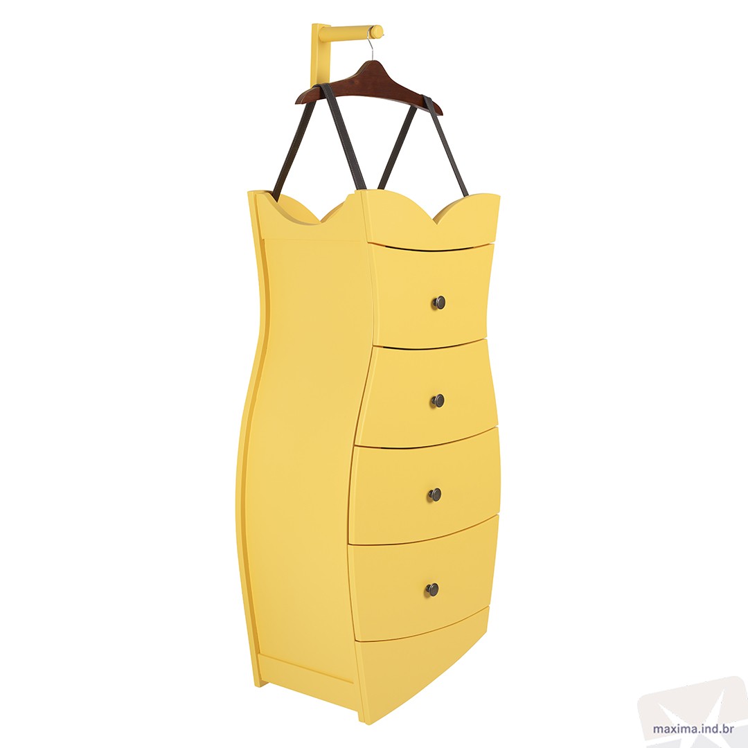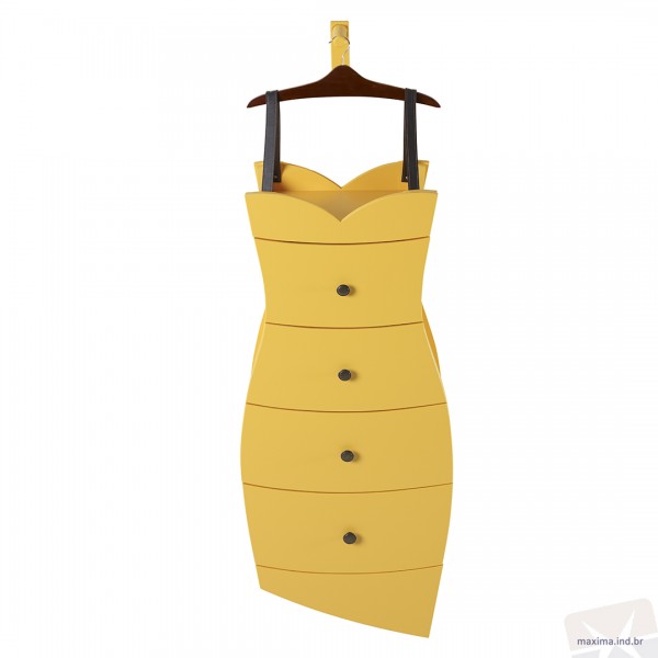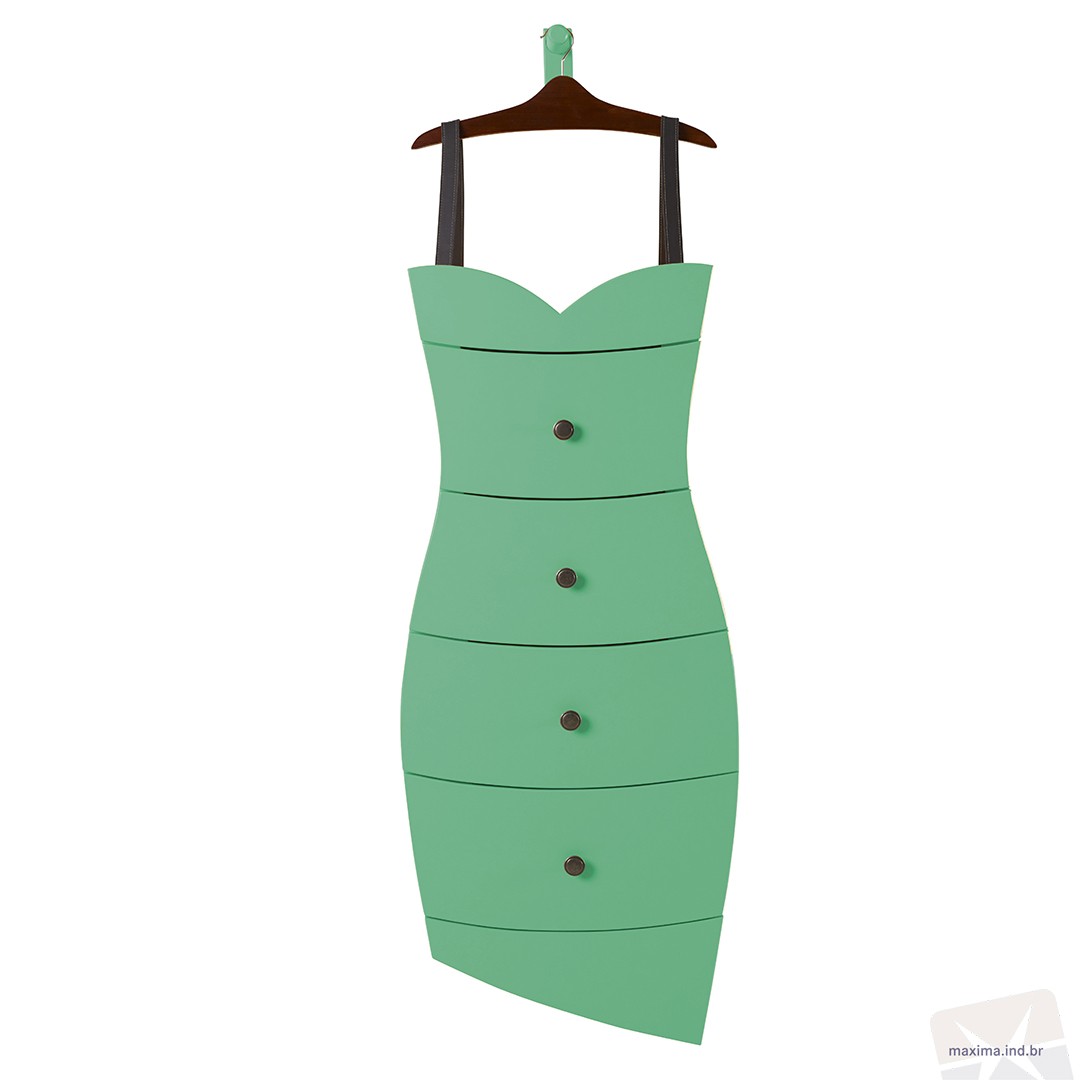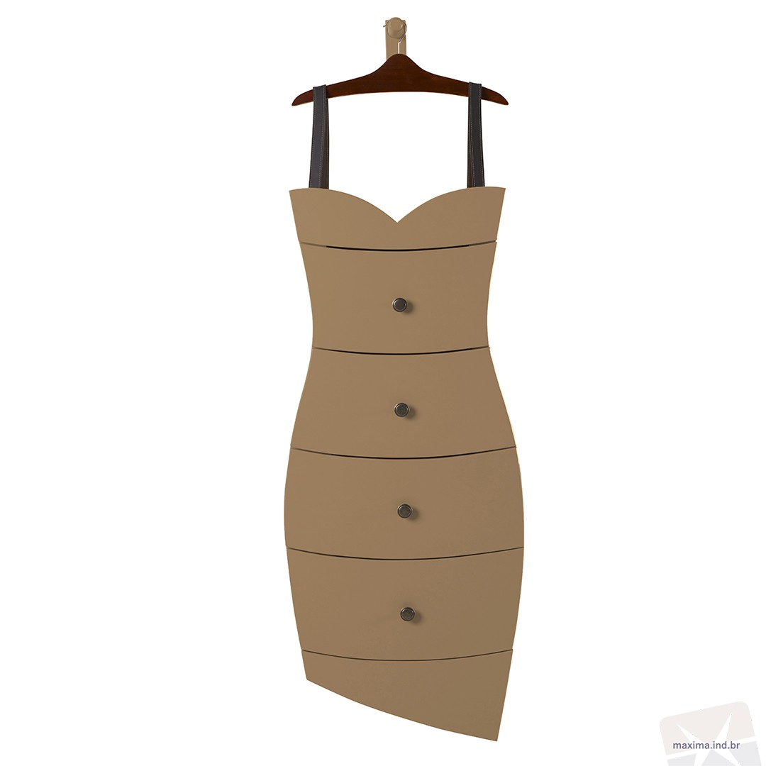 A cômoda Dress com o contorno e formato de vestido é perfeita para deixar o ambiente mais descolado, divertido e super moderno. Fixada na parede irá complementar sua decoração, com 04 gavetas é ideal para acomodar suas peças de vestuário ou objetos pessoais.