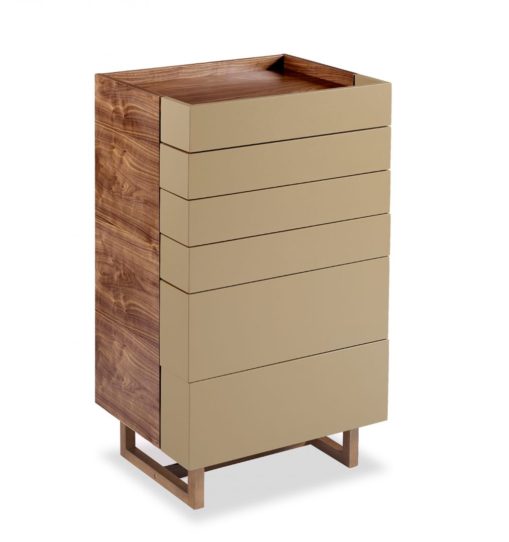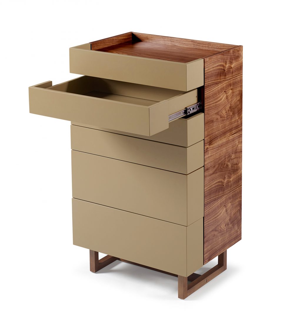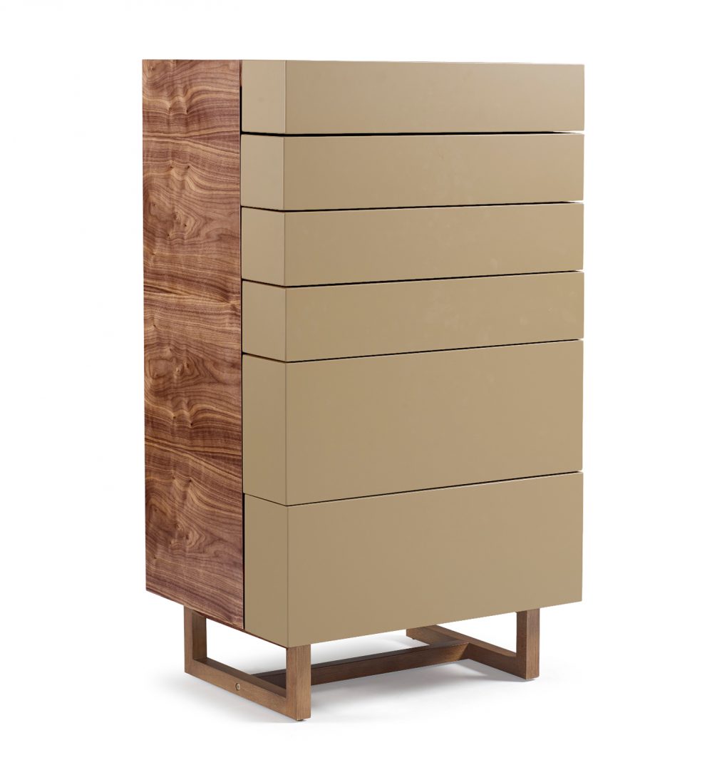 A linha une a estética forte e definida da madeira e mescla o acabamento em pintura em Laca fosca definido pela personalidade do cliente.